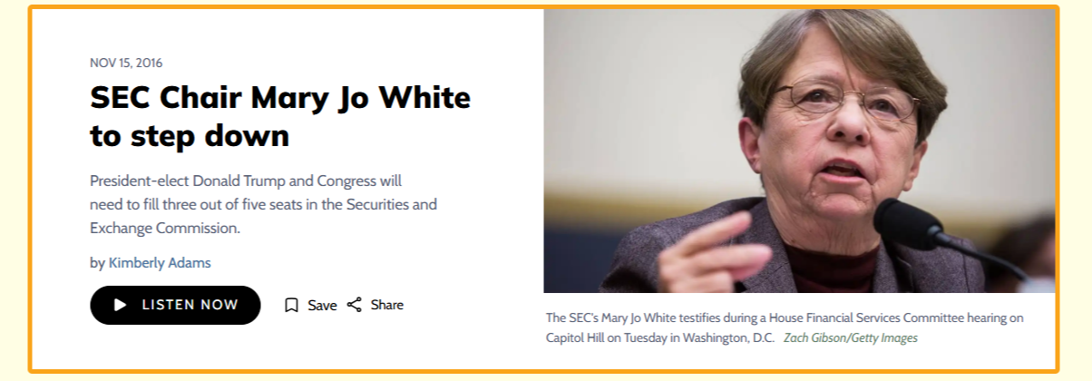 SEC Chair Mary Jo White to Step Down- NPR Marketplace Nov 2016